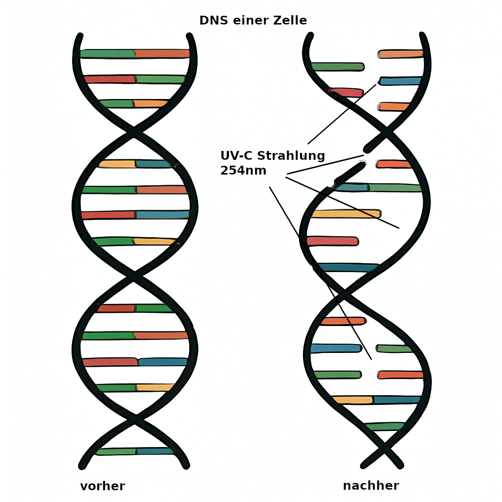 UV-C-Licht bei 254 nm dringt in Mikroorganismen ein und trifft dabei gezielt deren Erbgut (DNS/RNS). Dabei verursacht die energiereiche Strahlung strukturelle Defekte in der DNS, wodurch das fehlerfreie Ablesen genetischer Informationen verhindert wird. In der Folge können die Zellen ihre lebenswichtigen Funktionen nicht mehr aufrechterhalten. Darüber hinaus wird die Replikation, also die Vervielfältigung des Erbguts, gezielt gestört.